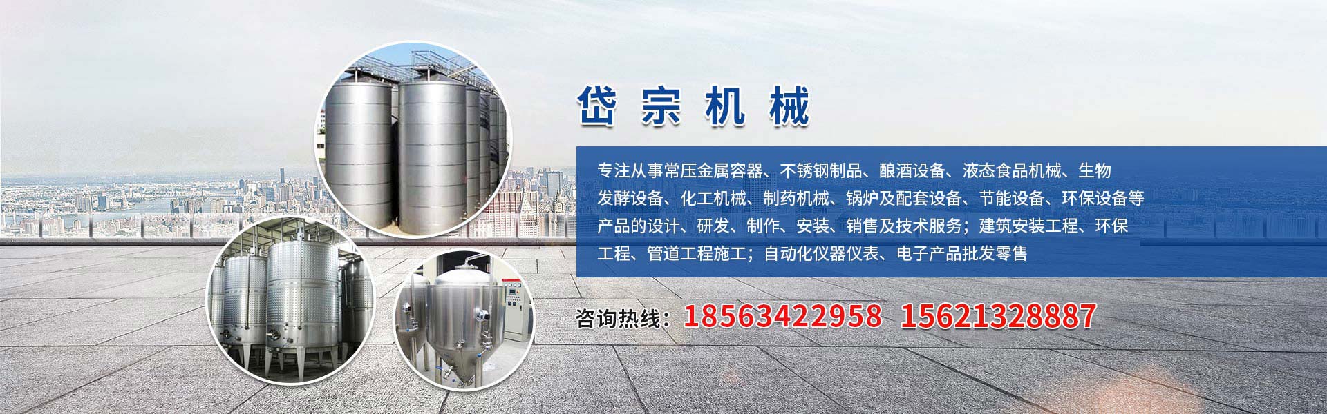 白酒釀酒設備  ·  啤酒釀酒設備   ·  葡萄酒、果酒釀酒設備   ·  果汁飲料設備  ·  生物化工設備   ·  乳品制藥設備   ·  管道工藝工程  ·  鍋爐、環保設備   ·  產品及配件